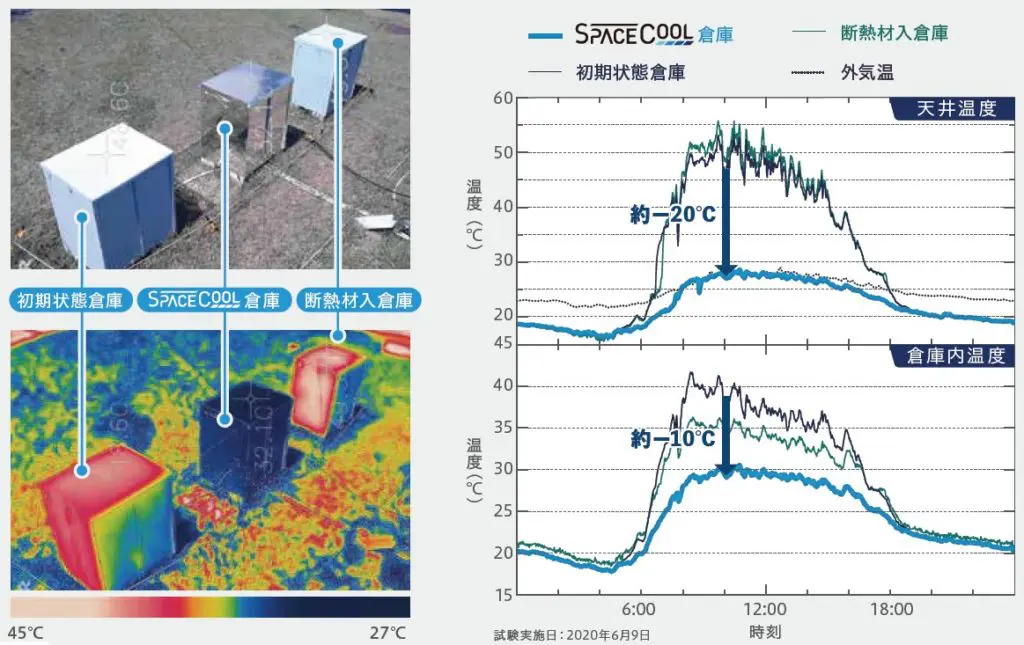 SPACECOOL®をコンテナに張り付けることで、コンテナ天井を40℃、コンテナ内部を10℃冷やすことが出来ました。