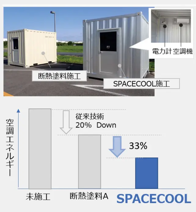 何も対策していない状態と比較すると46%もの消費電力の削減を確認しました。また、従来の断熱塗料と比較しても33%の消費電力削減に成功しています。